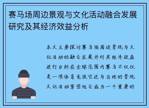 本文以“以赛马场为核心打造集运动、娱乐、文化、休闲于一体的现代化综合示范区”为主题,系统阐述了这一新型城市功能区的建设理念、规划布局、产业融合与社会效益。文章从整体构想、空间布局、产业协同和文化引领四个方面进行深入分析,探讨了如何通过赛马运动的独特魅力带动多元业态发展,构建具有国际视野与地方特色的高品质生活空间。现代化赛马场不仅是体育竞技的场所,更是集旅游休闲、文创体验、商业服务于一体的综合载体。...
